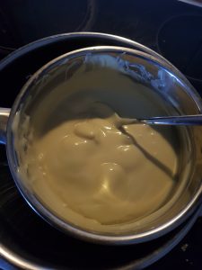 Smelt de chocolade au bain marie (een kleine pan in een grote pan warm water zetten en al roerend de chocolade laten smelten).